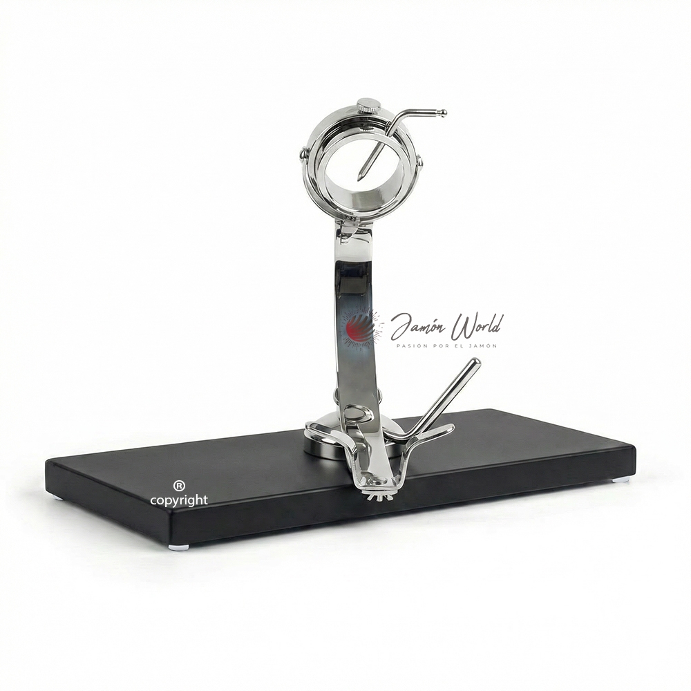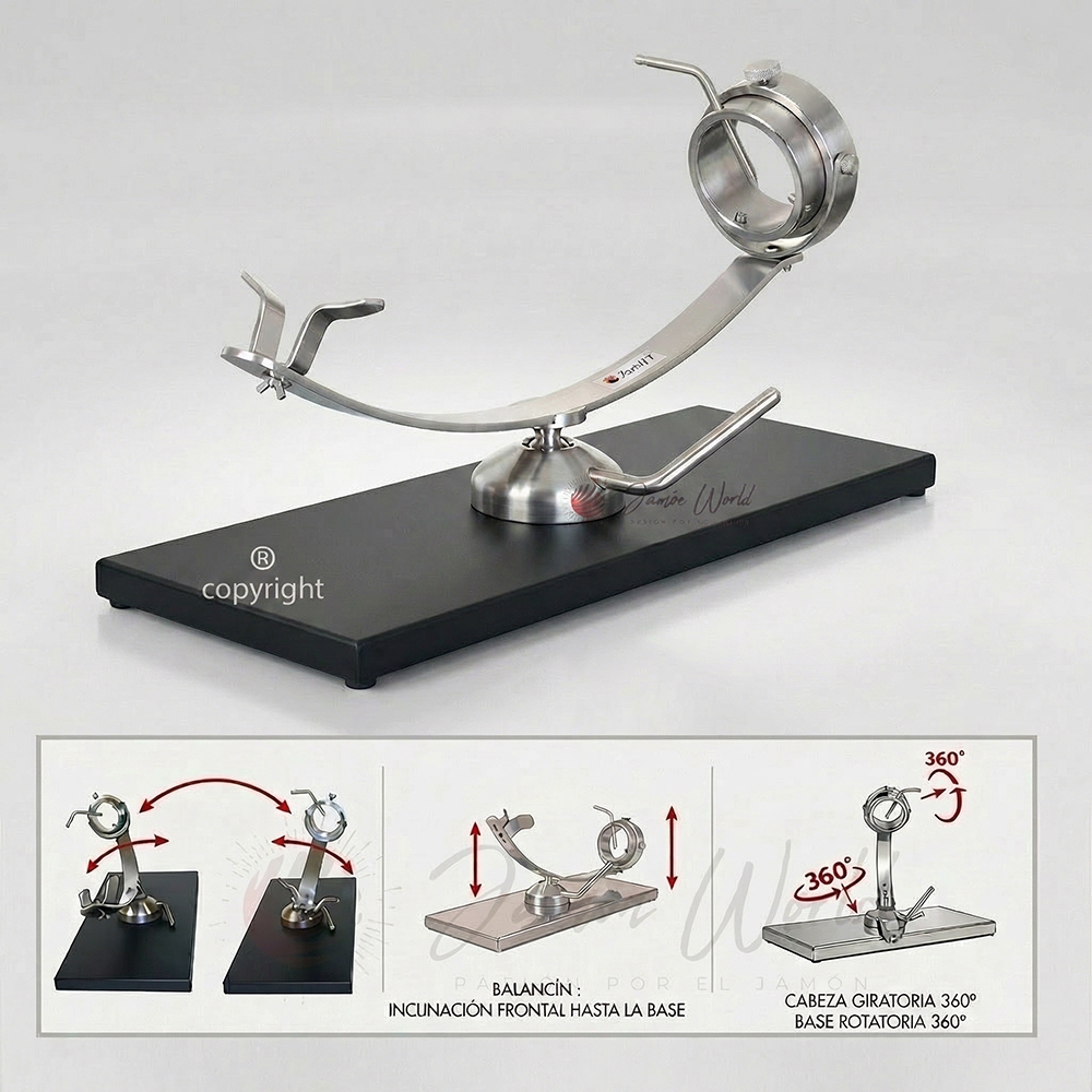 - Sistema giratorio 360º profesional para la pezuña: permite girar el jamón fácilmente sin desmontarlo, mejorando la precisión y rapidez en el corte.