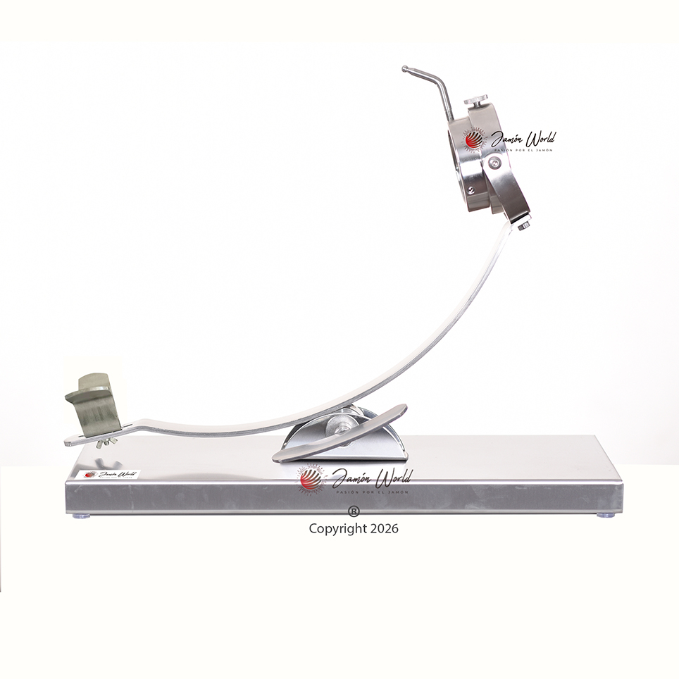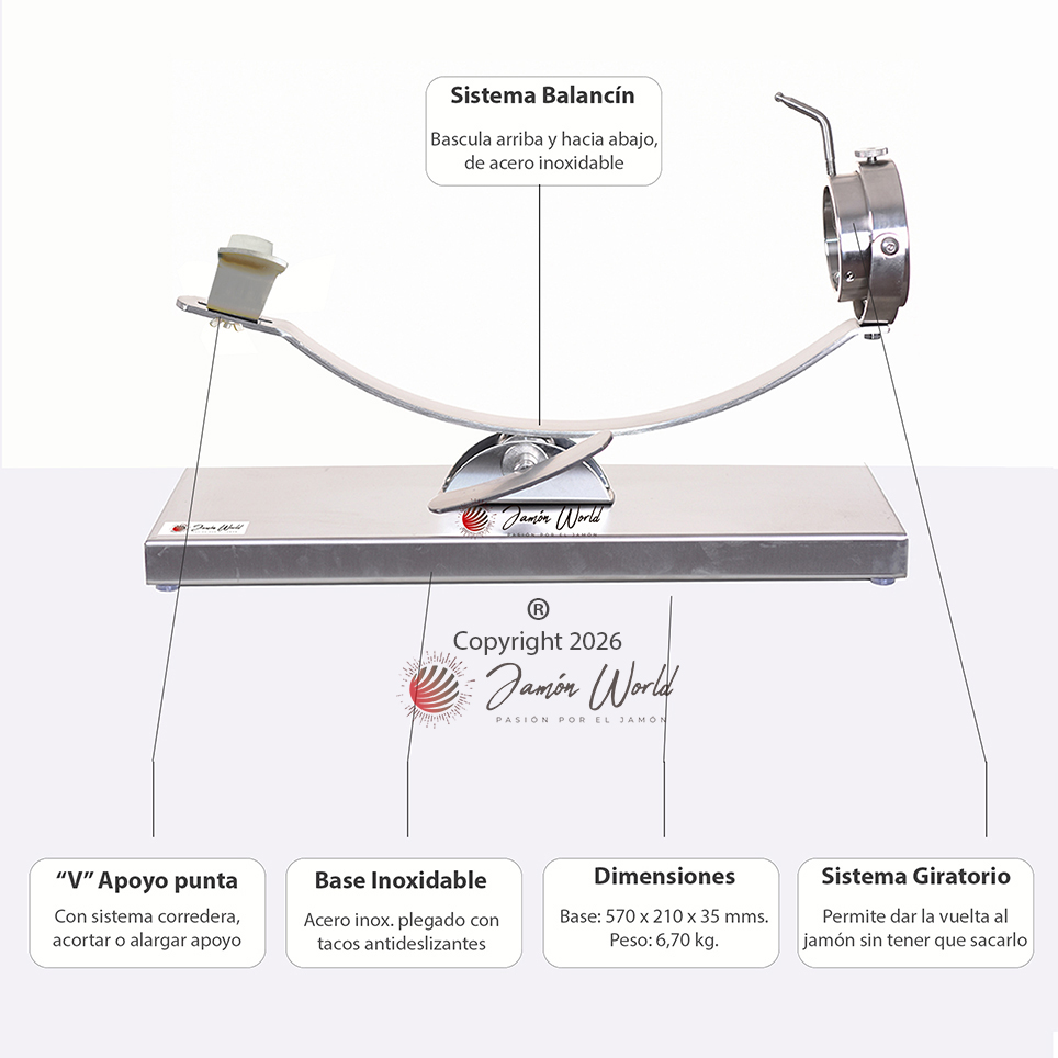 El jamonero 17927 puede moverse en balanza gracias a su pieza central de apoyo, lo cual permite colocar el jamón con gran facilidad en la situación más cómoda de corte según el momento y la necesidad de corte. Posee un cabezal con sistema giratorio de acero inoxidable macizo que permite dar la vuelta a la pieza sin necesidad de sacar el jamón del soporte. En la pletina de apoyo de la punta lleva una sistema corredera, donde se puede mover la V para graduar la distancia de apoyo. Esto permite colocar los jamones o paletas según tamaño y necesidad de pose. La V tiene un diseño sin pincho, para no taladrar el jamón, y no dañarlo. Conseguimos de esta forma lonchas perfectas de la zona y evitamos que no entre aire en la zona, que provoque la oxidación y desperfecto de la misma. La Uve está diseñada con forma para posar sin más la punta del jamón. El jamón debe de quedar bien sujeto en la pieza giratoria.